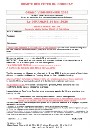 Vide-greniers organisé par le Comité des Fêtes 31 mai 2026 de 9h00 à 18h00 Télécharger la fiche d'inscription